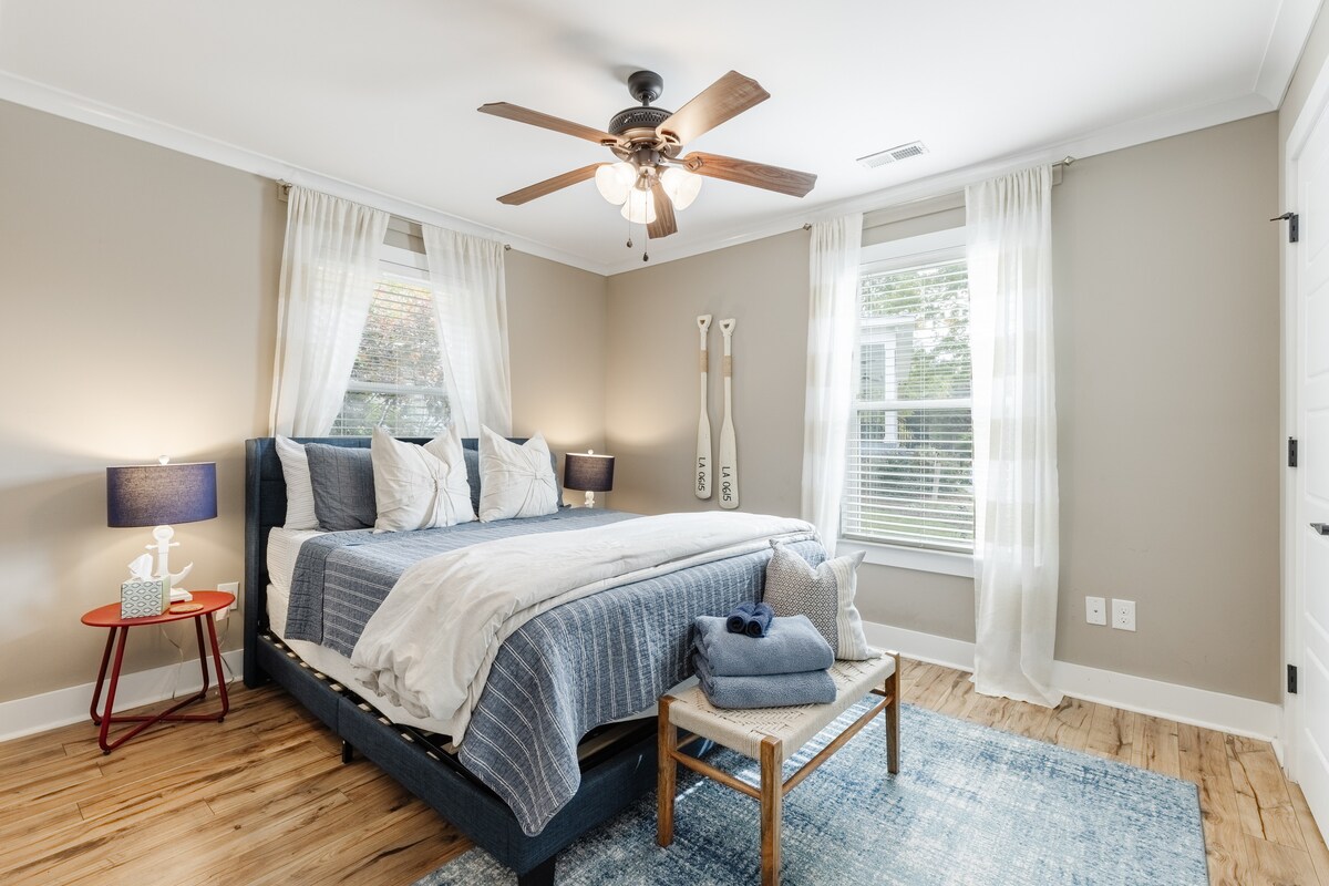 *No cleaning fee* Unwind in the spacious "Big Blue" overlooking a beautiful wood line along the Euchee Creek Greenway. Big Blue is set along the outer rim of a great neighborhood with no neighbors behind the property. This is perfect for sitting on the deck and enjoying the woodsy view with a large cup of coffee from our complimentary coffee bar. Whether you are a Masters tournament patron, traveling business professional, military family, or group of friends, Big Blue is a great fit for you.