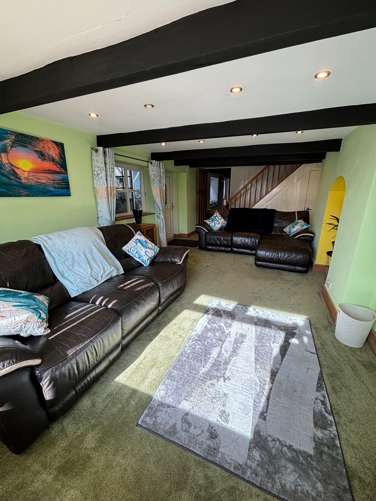 Ground floor sitting room , kitchen dining area, a log burning stove to relax by the fire,use in Winter only. Kitchen - bespoke cabinets, a granite worktop with electric Aga. An open plan style living/dining room bespoke dining table. Oak staircase to the first floor landing, master bedroom with king size bed, velvet padded headboard , a large round window has incredible views, true luxury. A seperate contemporary bathroom room, with a shower over bath, washbasin, wc and a heated towel rail.