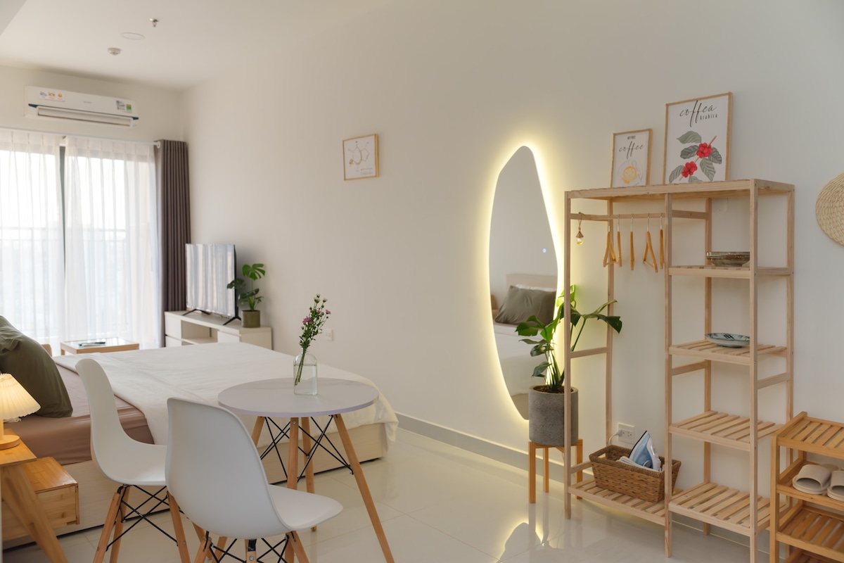 Nasze studio jest na Twój kolejny urlop w Sajgonie! Tropikalne wnętrze inspirowane jest słynnymi żółtymi domami Hoi An. Położony w centrum Sajgonu, znajduje się w odległości 10 minut spacerem od dzielnicy turystycznej. Nasz apartament posiada w pełni wyposażoną kuchnię, salon z balkonem i łazienkę z prysznicem z deszczownicą! Udogodnienia obejmują: o duże łóżko (king) o jakości hotelowej o telewizor z Netflix o głośnik Marshall blue-tooth o w pełni zaopatrzony barek kawowy o pralka ładowana od przodu o toaleta z bidetem