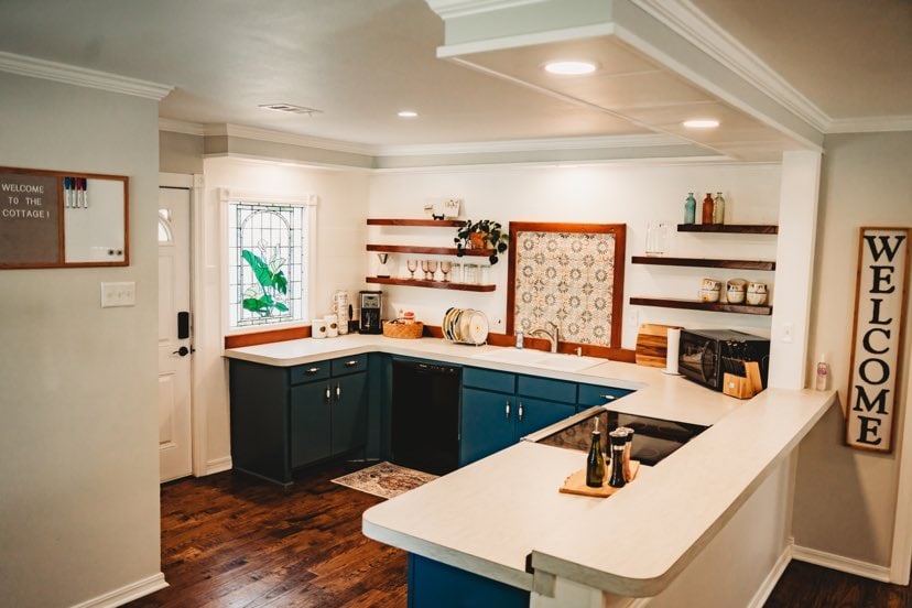 Convenient in town location. Enjoy the vaulted living room area, one bedroom, one bath villa decked out in an industrial décor, from reclaimed boxcar flooring wood countertops with steel trim to sliding barn doors. Everything you need to make your stay in Sulphur pleasant as possible at a budget friendly price. You are close to Chickasaw Recreation (Platt National Park) area, a unique downtown, arts centers and casinos as well as multiple fine restaurants.