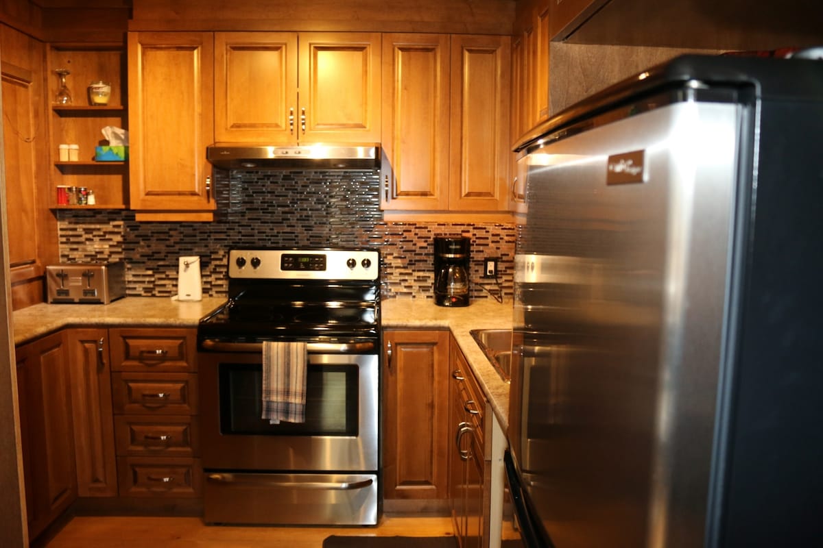 Located 20 minutes away from the hills of the Mont Orford, this cottage has everything everything to charm you. You will find a living room with natural light, a cozy dining room, a fully equipped kitchen, two closed bedrooms and a glass mezzanine with a sofa bed. A patio (with BBQ), a huge terrace and the basement are also at your disposal. The chalet is eco-friendly. You can enjoy it with peace of mind!