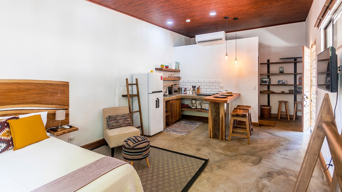 Witaj w tropikach w Playas del Coco! Ten przestronny apartament typu studio oferuje wygodę i wygodę, w odległości krótkiego spaceru od plaży. Z dużymi oknami i tętniącym życiem wystrojem, przestronna przestrzeń obejmuje przytulną część sypialną i w pełni wyposażony aneks kuchenny. Ciesz się łatwym dostępem do dziewiczych piasków do pływania i uprawiania sportów wodnych, a także do tętniącego życiem centrum miasta pełnego sklepów spożywczych, sklepów, pubów i różnorodnych restauracji. Po dniu pełnym przygód wróć do swojego spokojnego studia, aby się zrelaksować,