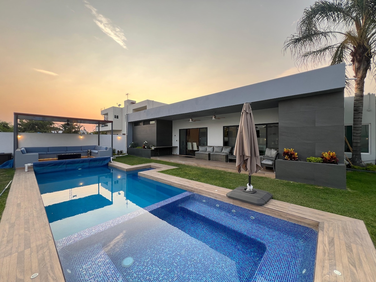 Komfortowy jednopoziomowy dom z wentylatorami, doskonale zlokalizowany w dzielnicy Lomas de Cocoyoc, parking na 3 samochody. 4 sypialnie, 3 pełne łazienki, kuchnia, jadalnia, salon z telewizorem z IZZI i Apple TV, WI-FI 60 Mbps światłowodowy. Taras, grill, prywatny ogród i przytulny basen z podgrzewaną wodą