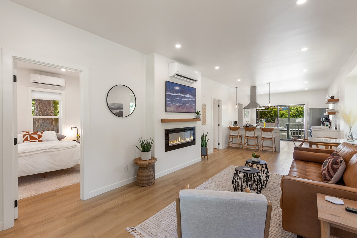 Zrelaksuj się w stylowym, doskonale położonym apartamencie/domku z materacem z pianki memory, prywatnym ogrodem z wanną z hydromasażem, grillem, stołem z ogniem i nastrojowymi światłami tuż za drzwiami. Obejmuje kuchnię szefa kuchni, ogrzewanie podłogowe, prysznic z 8 głowicami, grzejnik na ręczniki, klimatyzację, kominek, Wi-Fi, Netflix i więcej... Bezpłatny parking na miejscu, zaledwie jedną przecznicę na zachód od pubów, restauracji, sklepów odzieżowych i spożywczych w centrum miasta. Zaledwie sześć przecznic na południe znajduje się centrum miasta, plaża i parki. Drugie łóżko typu queen-size.