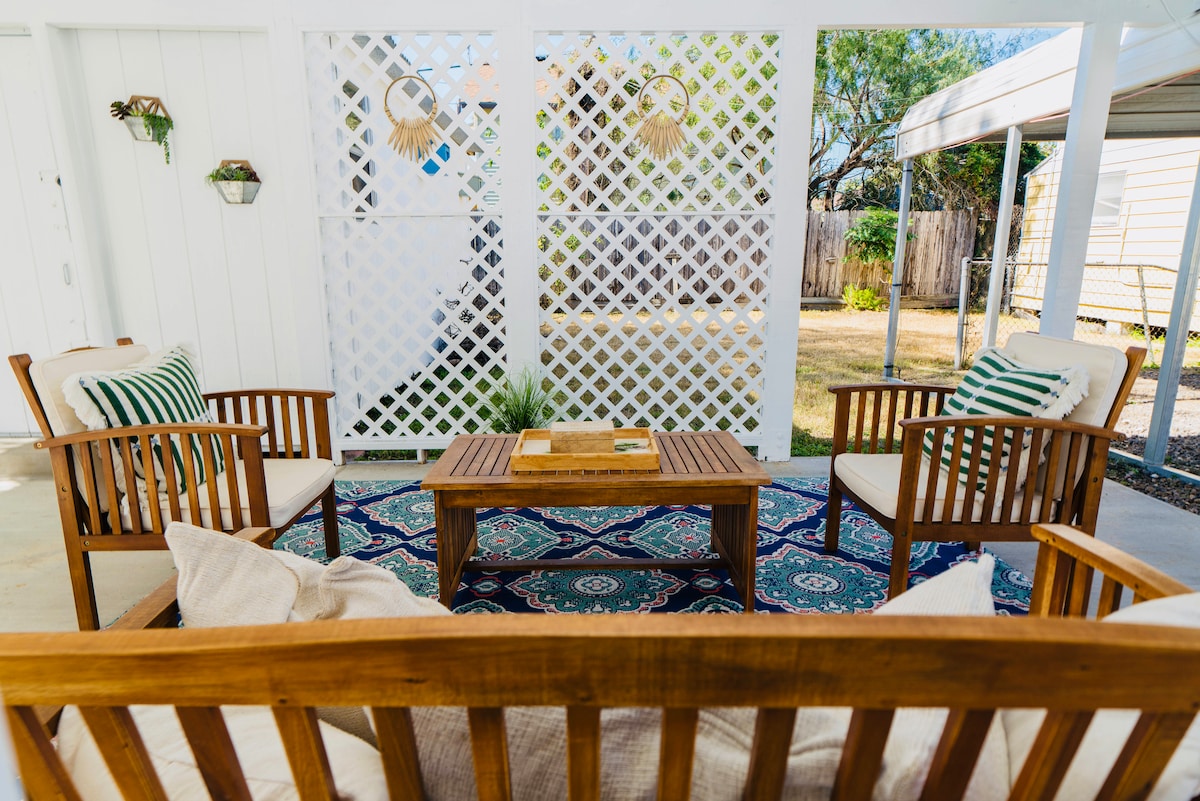 Przemyślany, aby uwzględnić wszystko, czego potrzebujesz, w pięknej małej przestrzeni. Goście mogą korzystać z parkingu przy ulicy, kilka kroków od prywatnego wejścia, prywatnego ganku i podwórka, które znajduje się naprzeciwko parku społeczności otoczonego 1 mi. pętla spacerowa. Komfortowo położony zaledwie 1,5 km od HEB i jednych z najlepszych restauracji/sklepów w naszym mieście w Lamar Park Center, zaledwie kilka mil od zapierających dech w piersiach widoków na zatokę i 20 minut jazdy od naszej ciepłej, piaszczystej plaży!