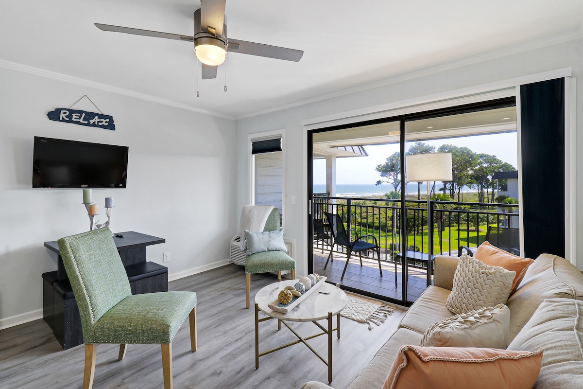 Oceanfront building with a side view of the ocean from the balcony. Park your car and walk to everything. This beautiful 2 bed/2 bath beach condo is perfect for your family vacation or romantic getaway. No streets to cross to get to the beach! Location, location, location. Gated entry, private, and just a 5-minute walk to all the amenities of Coligny Plaza (70 Shops & Restaurants). I also provide beach chairs, umbrella, and beach cart for your convenience during your stay!