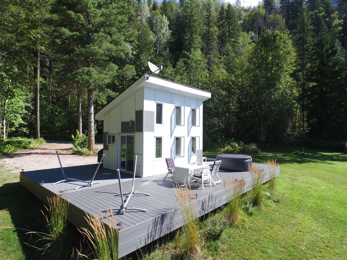 Przytulna, nowoczesna, 1 sypialnia z łóżkiem typu King, wolnostojąca chatka z rozkładaną sofą. Zawiera 3-częściową wannę z prysznicem parowym, aneks kuchenny, telewizor z płaskim ekranem w każdym pokoju, kominek gazowy, parking i prywatny taras. Goście mają dostęp do naszej 8-osobowej wanny z hydromasażem. Dogodna lokalizacja przy Trans-Canada Hwy poza Revelstoke (5 km na zachód) w ciągu 18 minut jazdy do Revelstoke Mountain Resort, 8 minut jazdy do centrum Revelstoke i kilka sekund drogi od tras dla skuterów śnieżnych!