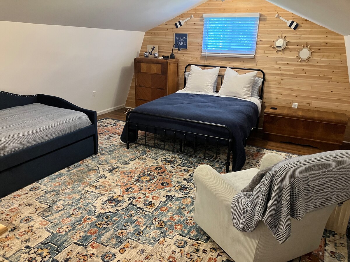 We offer one of the area’s only PRIVATE lake retreats. Come and enjoy a getaway in our peaceful lake community! The Town of Lake Waccamaw was incorporated in 1911, however, was inhabited by Native Americans for thousands of years. Southeastern North Carolina was covered by a shallow ocean more than two million years ago and you might find interesting fossils including sharks teeth, shells and coral as you swim in the shallow water. Be sure to visit Lake Waccamaw State Park to view the 2.75 million year old whale skull that was discovered embedded in a limestone outcropping several years ago. Measuring nearly 9,000 acres, the lake is unique in many ways ecologically with several endemic species of fish and mollusks (found nowhere else in the world).The lake is about 10 feet at the deepest with shallow waters along its shores, making it perfect for families with children. Tourist attractions include a local museum in a 1904 train depot, Lake Waccamaw State Park, our beautiful library, several restaurants, grocery and retail stores. The guest house is totally private from our home and features a vintage lake theme queen bedroom with flat screen television (Direct TV and DVD player), en suite bathroom with shower. All bed and bath linens are furnished. The common area/living room has a flat screen television (Direct TV and DVD player), a variety of movies, books and magazines, toys and board games for all ages. The fully equipped kitchen has a nice size refrigerator with a separate freezer, electric coffee pot or French press, microwave, and electric stove. A variety of cookware and utensils are available for your use as well as kitchen staple items. A washer and dryer is available in the garage below the apartment. We provide a few basic breakfast items for your first morning. There is a grocery store nearby for most anything else you would need. The living room couch/futon converts to a very comfortable full size bed. There is a large desk for our business clients and free WiFi. Other furnishings include a table with four chairs, rocking chair and leather recliner. Guests have access to an outdoor kitchen with a gas stove, and a double sink. You may use the charcoal or gas grill, enjoy the fire pit (wood provided), several bicycles, and two kayaks. We also have corn hole boards and other yard games you may use. Sorry, we are not able to accommodate your pets, but can recommend a delightful getaway for them. Although our log cabin isn’t on the lake front, it is just steps (the length of a football field!) from your apartment. You may use the pier for sunning, swimming, launching a kayak, fishing, relaxing or picnicking under the shaded canopy. Lake Waccamaw is conveniently located one hour from many beaches in Wilmington, N.C. and one hour from Myrtle Beach, S.C. We personally recommend Sunset Beach, which is about an hour.l