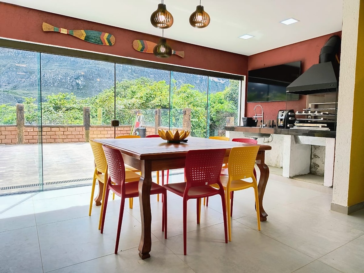 **WSPANIAŁY WIDOK NA GÓRY!!! Cały dom w Lapinha da Serra-MG, z balkonami, tarasem, basenem i wspaniałym widokiem na góry, zaledwie 5 minut spacerem od wioski. -3 pokoje, w tym 2 apartamenty + 1 pokój z pojedynczymi łóżkami - Łazienka - Pełna kuchnia z zamrażarką zewnętrzną i Frytkownicą beztłuszczową - Piwnica na wino - Pokój z kominkiem - Pokój telewizyjny z SKY i DVD - Boczny balkon ze stołem i piecem na drewno - Balkon z tarasem i basenem - Prysznic na zewnątrz - Przenośny grill - Wi-Fi Witamy!