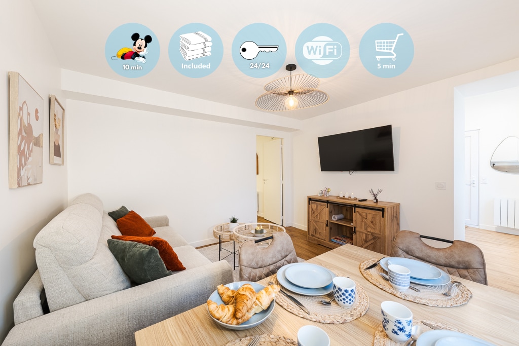 WSPANIAŁE NOWE APARTAMENTY W POBLIŻU DISNEYLANDU 😃 Nowa pościel. Rozkładana sofa w salonie wymieniona 23 lutego 2025 roku, z materacem o grubości 18 cm zapewniającym wysoką jakość snu. 2 bezpłatne miejsca parkingowe na prywatnym parkingu budynku. Przystanek autobusowy (linia 19 Meaux-Marne la Vallée Chessy) w odległości 2 minut spacerem. W pobliżu Disneylandu w Paryżu, Vallée Village i Village Nature. Ręczniki i pościel są dostarczane na miejscu bez dodatkowych opłat.