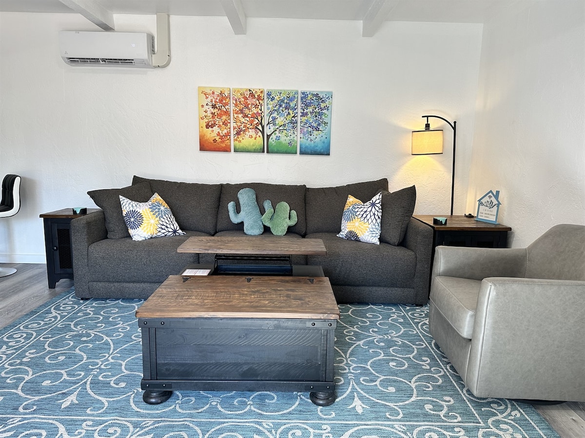 Zrelaksuj się w naturalnym świetle i luksusowych spotkaniach tego nowoczesnego studia położonego w parku miejskim i dołączonym do naszego głównego domu. Pięknie odnowione i zalane światłem, przestronne 375 stóp kwadratowych to idealny dom z dala od domu do odkrywania cudów Flagstaff i północnego AZ. Udogodnienia takie jak miękka pościel, w pełni zaopatrzony aneks kuchenny i telewizor Smart TV łączą się z dodatkowymi akcentami, takimi jak pralnia, prysznic z deszczownicą, relaksujące wspólne patio i Wi-Fi 400 Mb. Uwaga: brak klimatyzacji. Witamy!