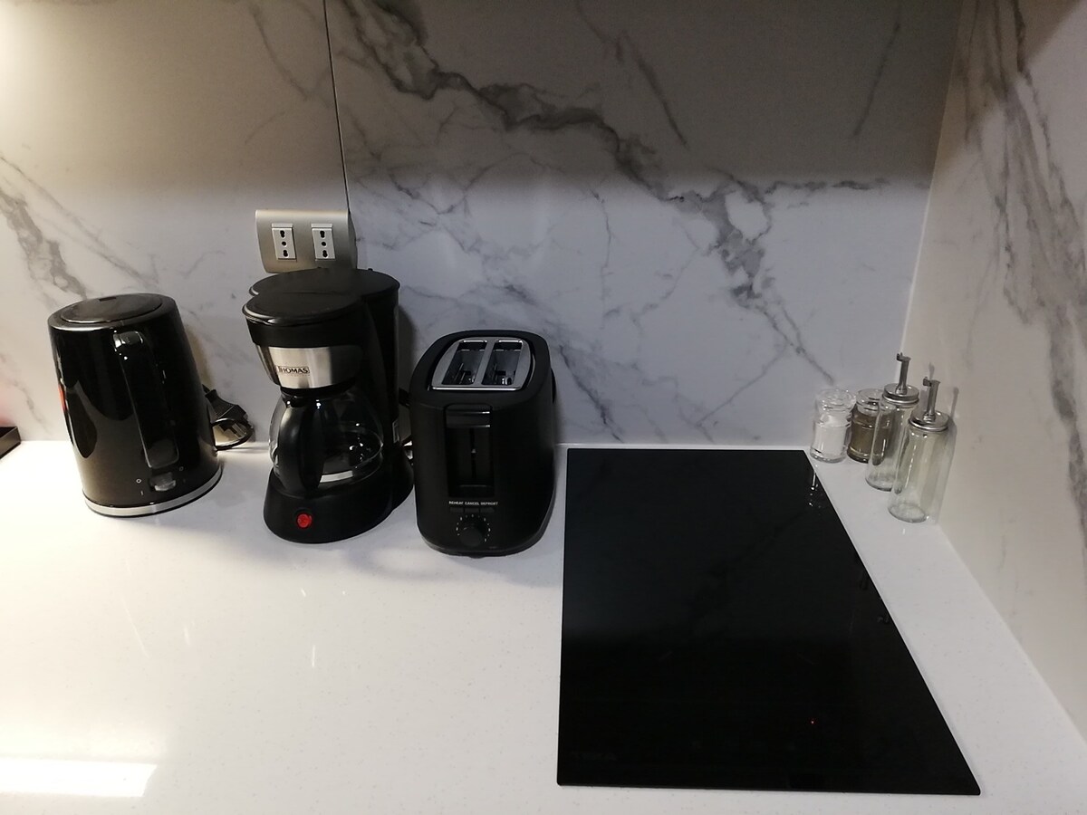 Ciesz się pobytem w dobrym stylu i komforcie dla 4 osób. Co znajdziesz: Klimatyzacja Chłodzenie/Ogrzewanie 1 pokój z łóżkiem typu king 1 rozkładana sofa 1 pełna łazienka z szamponem, odżywką, mydłem do ciała i suszarką do włosów Wyposażona kuchnia: ekspres do kawy, kuchenka mikrofalowa, toster, czajnik i piekarnik. Idealne do przygotowywania ulubionych posiłków. Miejsce do pracy, Wi-Fi i biurko – idealne dla osób pracujących zdalnie Pralka/suszarka w apartamencie dla wygody. Prywatny i bezpłatny parking Basen Siłownia. Quincho