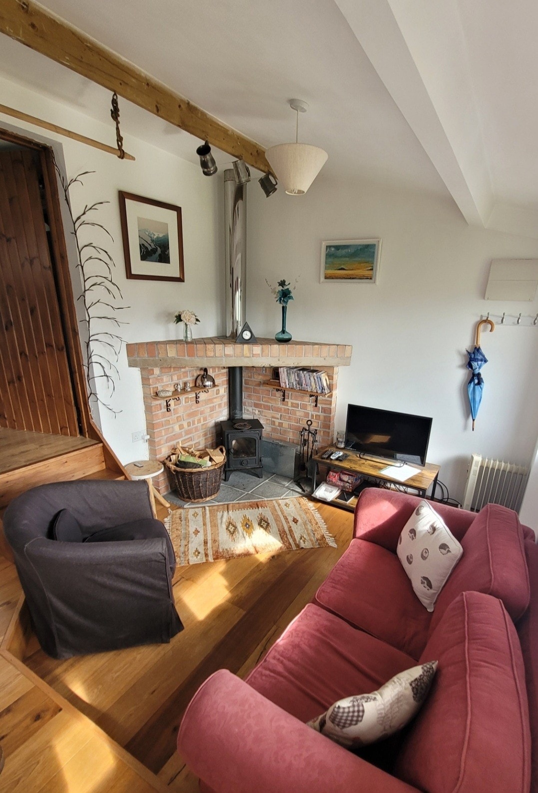 Samodzielna przebudowa garażu składająca się z: Sypialnia (podwójne łóżko), łazienka, przytulna przestrzeń mieszkalna z piecem na drewno. Kuchnia z płytą grzewczą (BEZ PIEKARNIKA), frytkownica powietrzna, lodówka, czajnik i kuchenka mikrofalowa. Herbata/kawa/mleko i niektóre artykuły śniadaniowe (chleb/płatki śniadaniowe) są zapewnione. Podobnie jak ręczniki i pościel, rolka toaletowa i mydło do rąk. Zewnętrzna część wypoczynkowa z widokiem na okolicę. 5 minut pieszo do ścieżki przybrzeżnej. Uroczy wiejski pub z pięknym widokiem na morze w odległości spaceru. Niestety nie zezwalamy na pobyt ze zwierzętami.