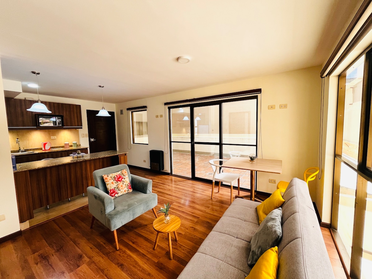 One bedroom apartment with private terrace in Sopocachi. Enjoy a unique stay in this beautiful private one bedroom apartment, designed to offer you comfort, warmth and tranquility. Located in Sopocachi, one of the safest and most central areas of La Paz, you will be surrounded by cafes, restaurants, bars and art galleries, with easy access to public transportation and only two blocks from Plaza Avaroa and Plaza España.
