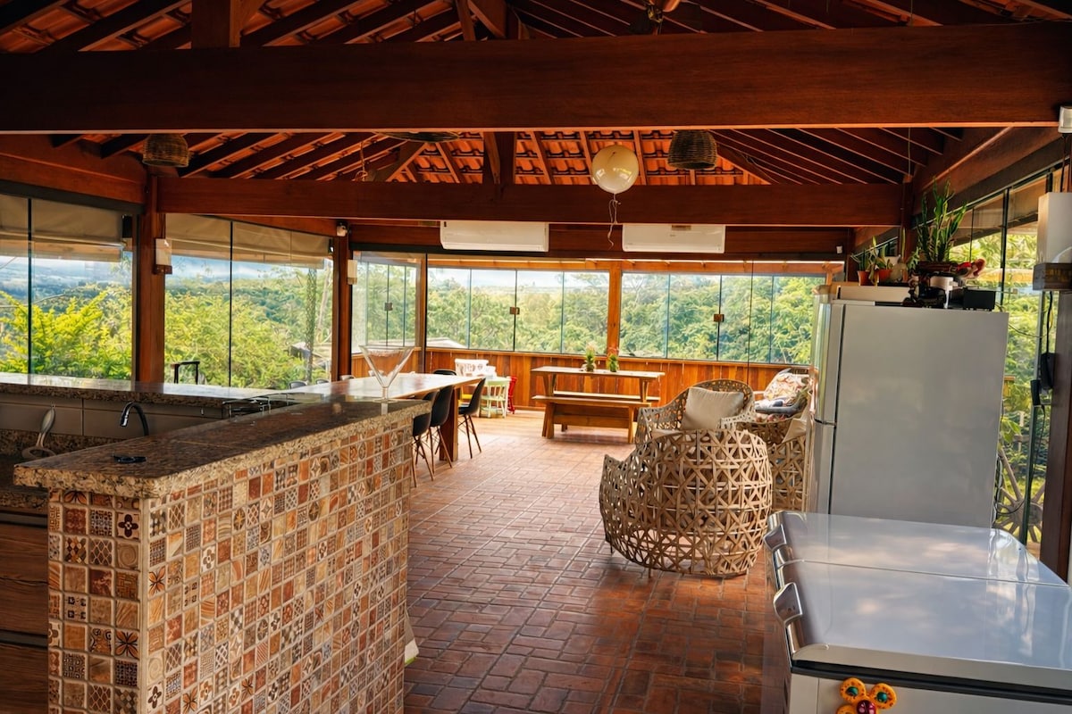 A Vila Natural é dedicada aos amantes da natureza e dos bons momentos. Quiosque com cozinha completa. Fogão 2 bocas, churrasqueira e geladeira. Gramado com 1000m² para curtir momentos no redários, nas duchas, espaço fogueira e piscina, exclusivos. (Não tem Wi-Fi. Dados móveis costuma funcionar) Os dois banheiros são completos e atendem tanto o quiosque como cabanas. A trilha e o rio estao disponíveis em algumas época do ano, a depender das condições climáticas.