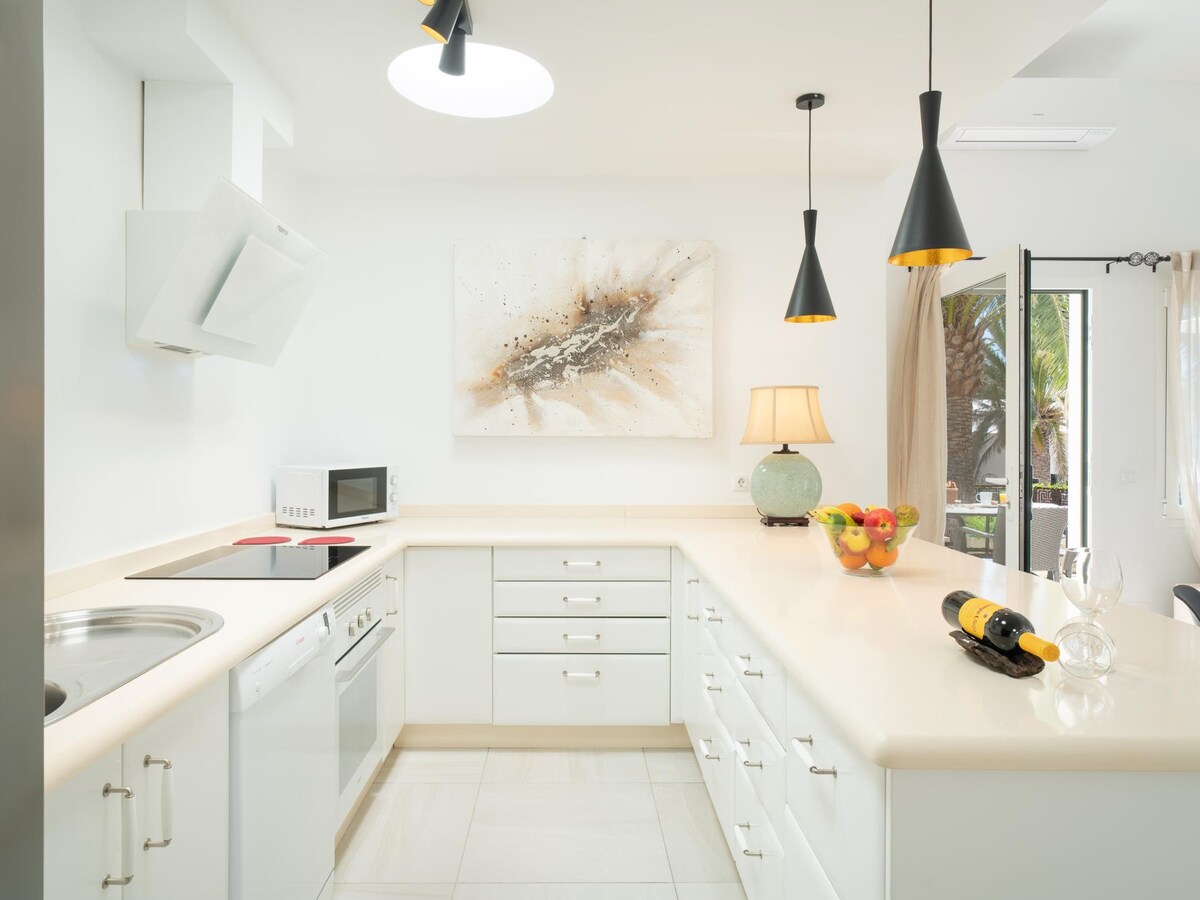 Luksusowy apartament znajduje się w najbardziej eleganckim i prestiżowym prywatnym kompleksie Costa Teguise przy Playa del Jablillo. Został gruntownie odnowiony w 2023 roku. Dwie sypialnie wyposażone są w luksusowe łóżka małżeńskie (160 x 200 i 150 x 200), a także wysokiej jakości komfortowe materace z pościelą dla alergików. Kuchnia wyposażona jest w: zmywarkę, lodówkę i zamrażarkę, płytę ceramiczną, piekarnik, ekspres do kawy i spieniacz do mleka. Dostępne jest szybkie Wi-Fi i inteligentny telewizor.