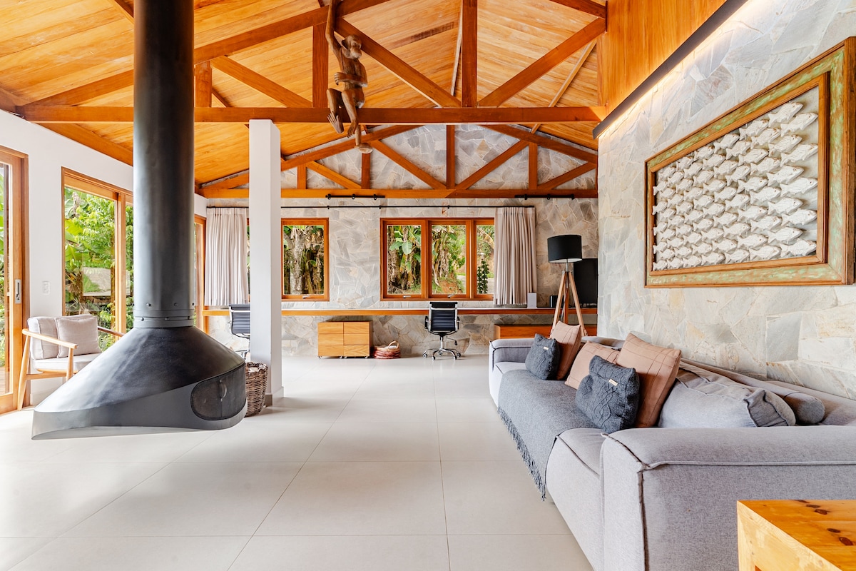 Dom w stylu i wygodzie , 5-gwiazdkowy apartament (prysznic gazowy i duża wanna dla dwojga z wodą, klimatyzacja, wentylator sufitowy, wysokiej jakości kołdra queen, prześcieradła bawełniane 400 drutu,telewizor, szybkie Wi-Fi - dwóch dostawców, balkon z siatką, widok na las Atlantycki i przestronna szafa. Dla Twojego dodatkowego komfortu - kominek, pełna kuchnia i kiosk-churrasqueira, basen dla dwóch osób z prywatną sauną i rzeka. Ogrodzony ogród dla Twojego zwierzaka. Ciche Condominio, łatwy dostęp do plaż.