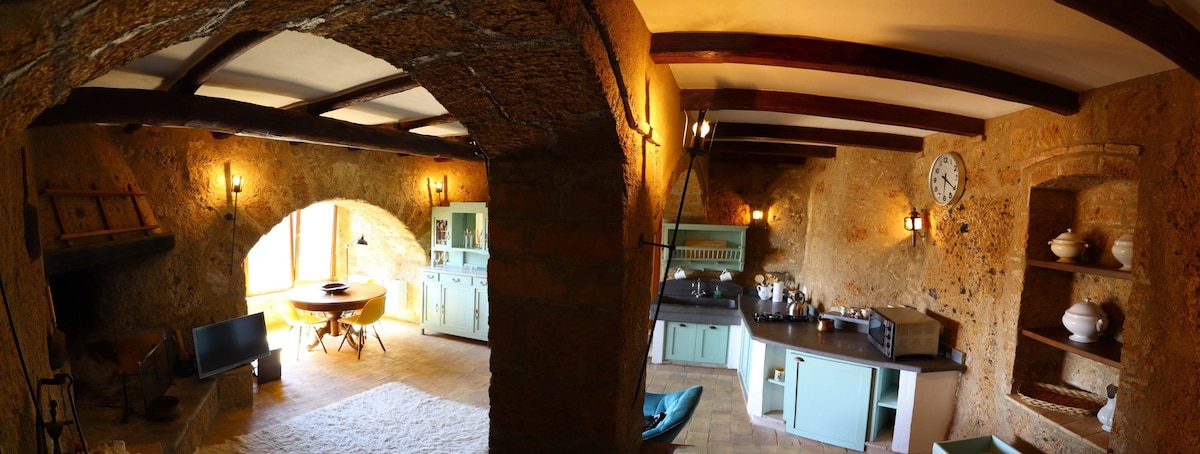 Apartament znajduje się dwa piętra poniżej placu, całkowicie wykuty w tufie. Z widokiem na dolinę, jest odizolowany od hałasu ulicy, cichy, prywatny i bardzo przyjazny. Ściany z tufu nadają mu starożytny wygląd, przenosząc Cię w czasie. Można do niego dotrzeć pieszo, przez most dla pieszych, który prowadzi bezpośrednio na plac, na którym znajduje się budynek. Jest idealny na krótkie pobyty pełne relaksu, a dzięki w pełni wyposażonej kuchni można w pełni wykorzystać jego potencjał.