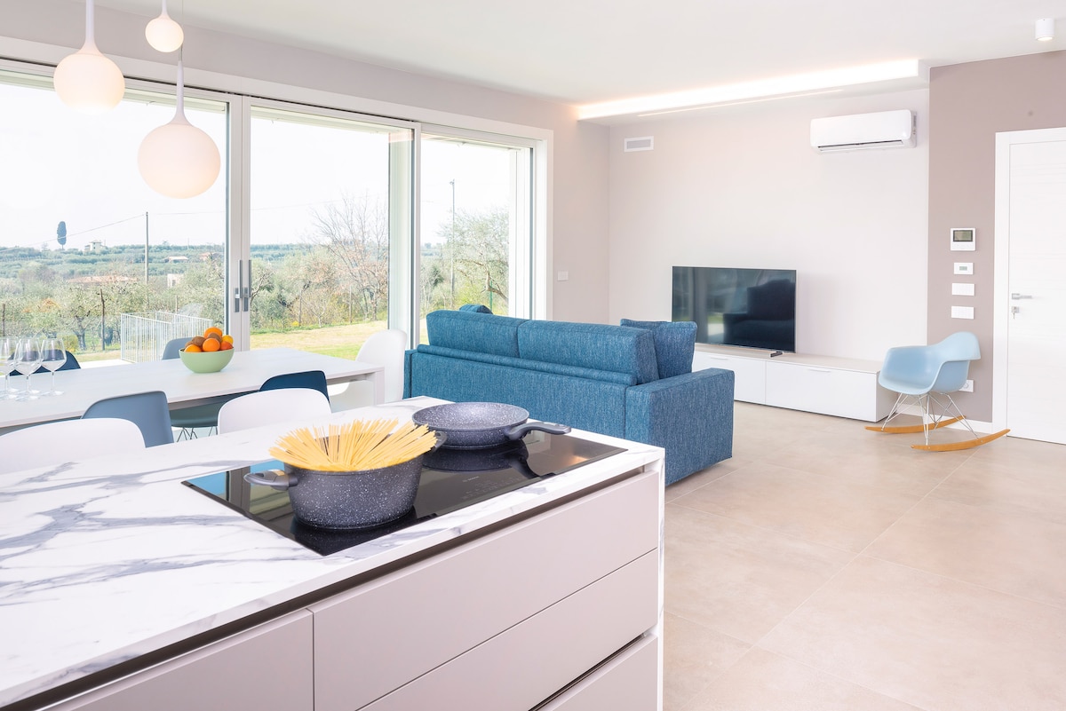 Duży, jasny i przytulny apartament w spokojnym wnętrzu Garda, 5 minut samochodem od brzegu jeziora. Szeroki taras ze wspaniałym, niezakłóconym widokiem na okoliczne winnice i gaje oliwne. Dostępne są dwa rowery. Dobre restauracje znajdują się w odległości krótkiego spaceru. Przystanek dla bezpłatnego lokalnego autobusu wahadłowego znajduje się 300 metrów stąd. Przyjmuję tylko gości, którzy zostali zaszczepieni w związku z COVID-19.