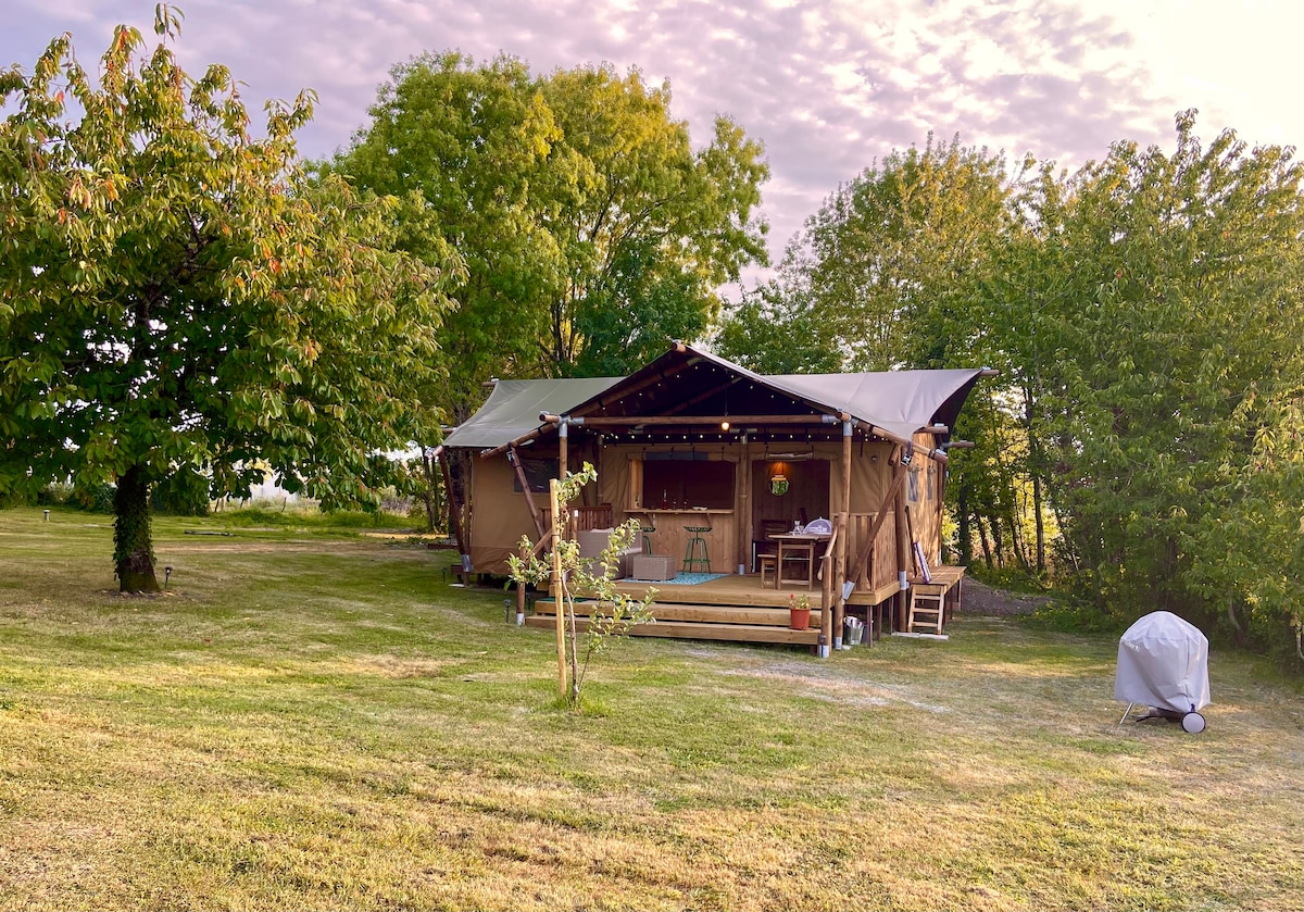Lodge Safari to luksusowy namiot z drewnianym szkieletem, wygodny i przestronny, idealny na pobyt inny niż wszystkie. Namiot Lodge znajduje się w zalesionym parku naszej posiadłości, nie ma bezpośredniego kontaktu z naszym domem i dwoma innymi domkami. Zmiana scenerii czeka na Ciebie w wiosce na zboczach winnic i pól, licznych producentów koniaku i pineau. Z tarasu rozciąga się widok na część parku, liczne drzewa, wzgórzaś okoliczne winnice.