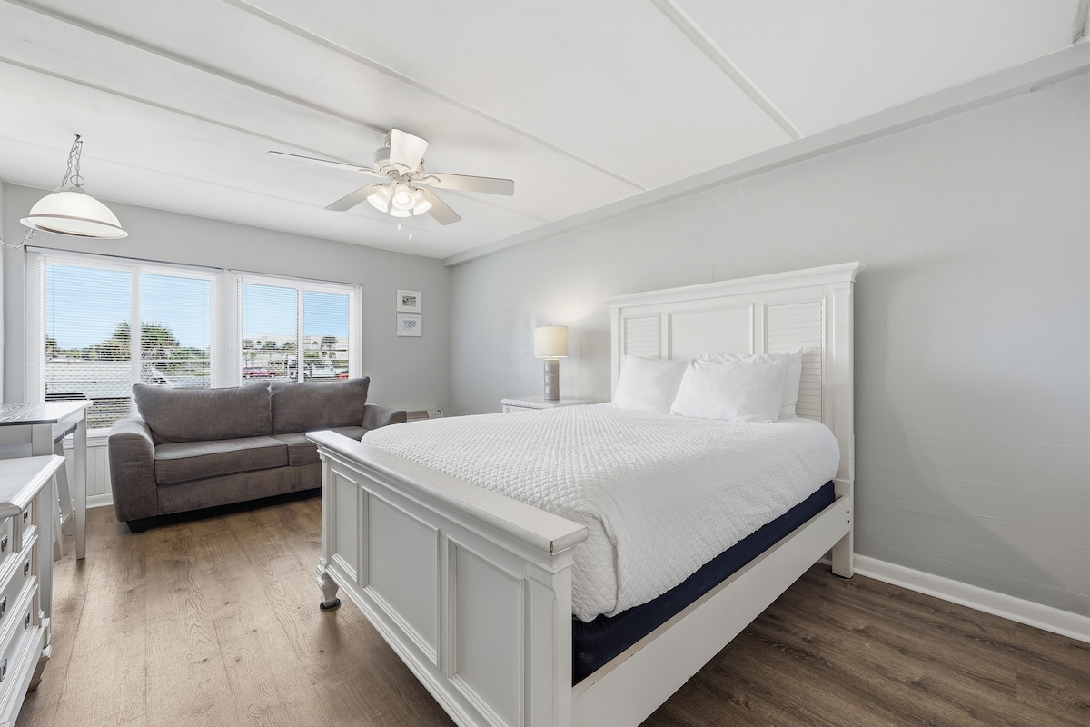 Beachers Lodge faces the ocean! All rooms are disinfected after each stay as a precautionary measure to ensure a safe stay. Bedroom with king bed. New flooring, furniture, new shower, fresh paint, towels, linens! Kitchenette with oven, living room with queen sleeper sofa and dining area. Living room opens to ocean-front patio on first floor with limited ocean views. The unit is < 400 sq Ft total. 15 min from downtown