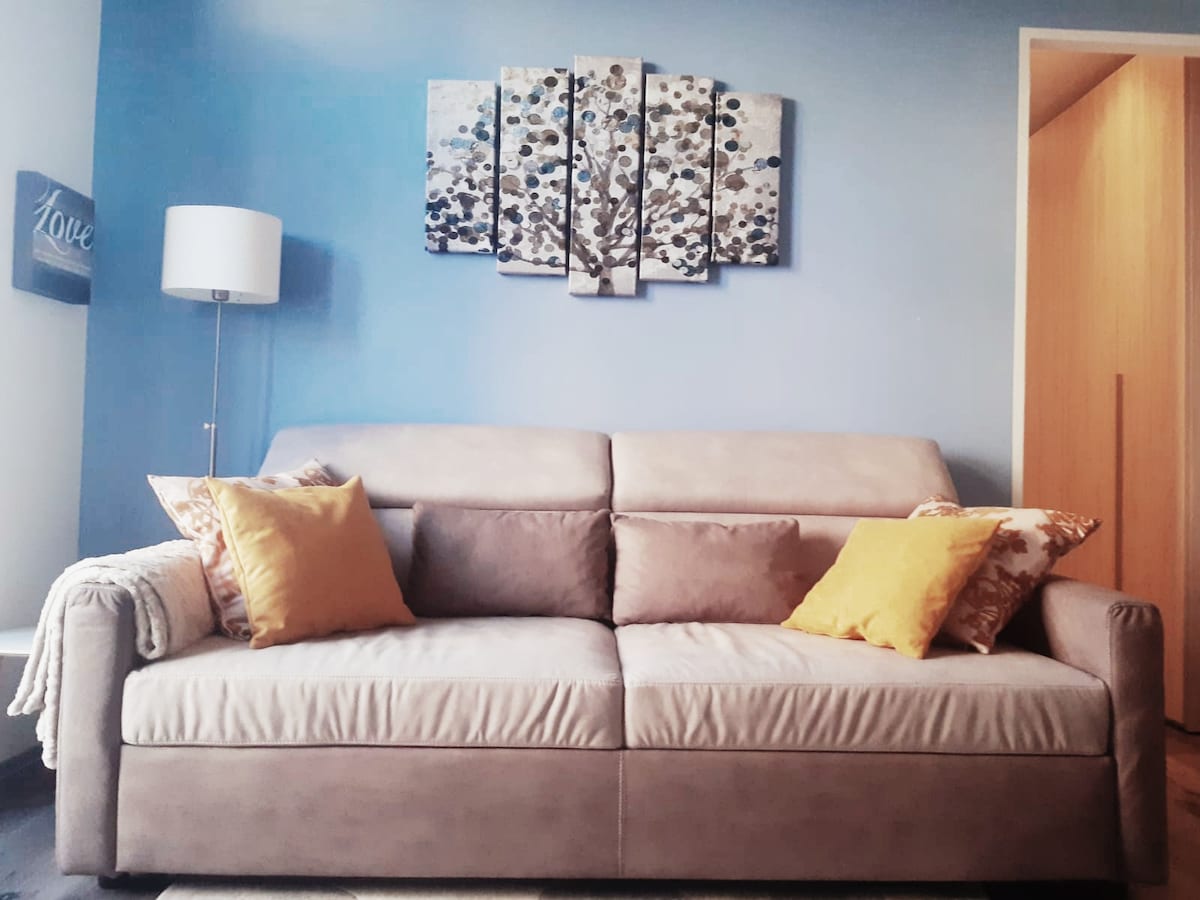 Apartament typu open space, na pierwszym piętrze Casa Lucy. Typowy górski dom w pastelowych kolorze, z kamiennym dachem, oknami z podwójnymi szybami i okiennicami. Idealny na romantyczny weekend lub jako baza wypadowa do wycieczek w góry i nad jeziora. Znajduje się 10 minut od dworca i 5 minut od głównego placu. Na ulicy znajdują się bezpłatne miejsca parkingowe. Meble są nowe i nowoczesne, kuchnia wyposażona w płytę indukcyjną, kuchenkę mikrofalową, toster, naczynia i akcesoria, telewizor, łóżko małżeńskie 160x200 cm. Ogrzewanie powietrzne
