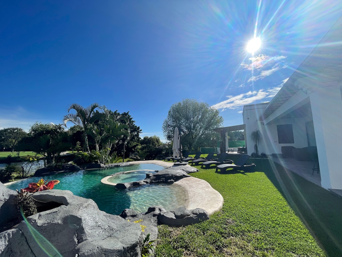 Wypoczynek w luksusowym domu w Lomas de Cocoyoc: basen z podgrzewaną wodą w stylu plażowym, jacuzzi z widokiem na jezioro/pole golfowe, palenisko, ogród, palapa z grillem, 5 sypialni z klimatyzacją i prywatną łazienką. Idealne dla rodzin, grup lub na niezapomniane weekendy.