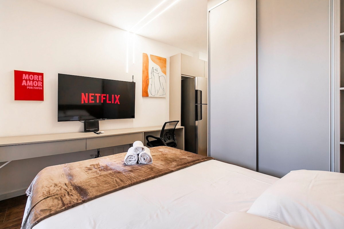 Ambiente aconchegante e refinado, perfeito para quem busca conforto premium em SP. Cozinha completa: sanducheira, micro-ondas, cooktop, frigobar, filtro de água gelada e utensílios. Decoração moderna, ar-condicionado, Wi-Fi ultrarrápido e TV smart. Cama casal e sofa futton de casal, iluminação aconchegante e organização impecável. Localização nobre: perto de Metrô, parques, restaurantes, farmácias e hospitais. Venha curtir São Paulo com estilo e conforto!