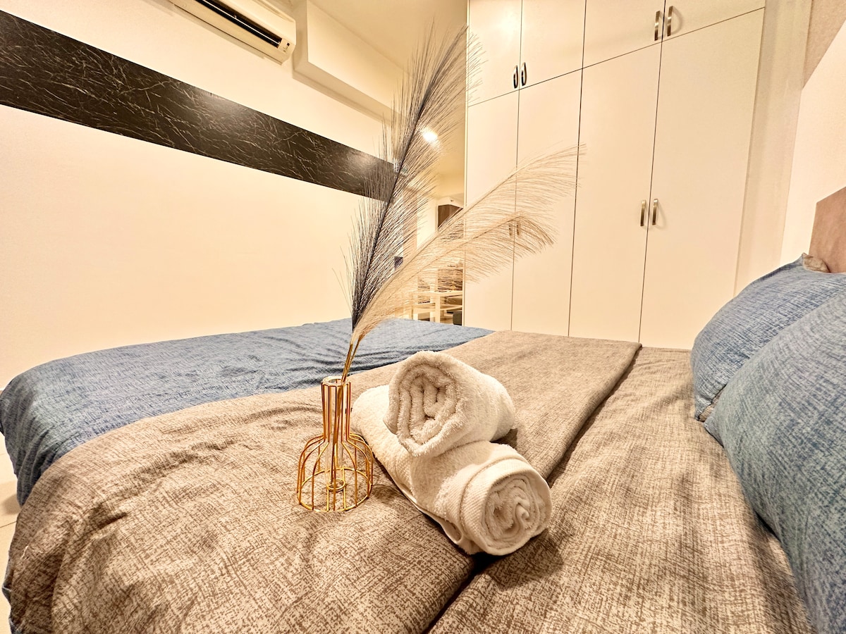 Explore our cozy studio, which can accommodate 2 to 3 people with a queen bed and a sofa bed. Only a 15-minute drive from KLIA T1/T2, the place is surrounded by many restaurants, fast food branches, groceries, and laundry shops, all within walking distance. Savor all the amenities, including the kids’ playground, BBQ area, gym, and swimming pool, with 24/7 security. * Unavailable drop your luggage before check in hours.Due to building designed, need to walk 10 steps staircase to get elevator.