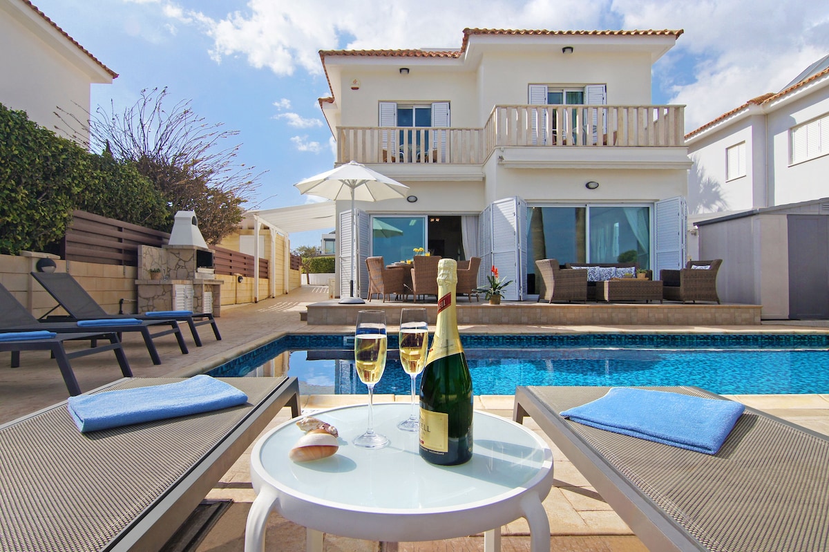 Located within stunning surroundings in the highly popular Green Bay/ Cape Greco area of Protaras, the villa's elevated position provides magnificent sea views of the Mediterranean. Numerous sandy beaches with crystal clear waters are located within strolling distance of the villas. The villa has been designed and constructed with precision and incorporates high quality materials with a finishing touch that will satisfy the highest of expectations.