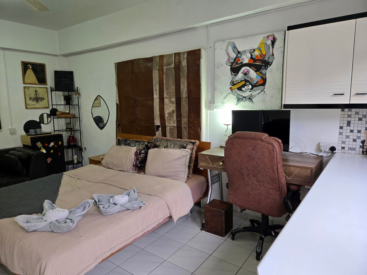 Enjoy your escape of the routine life in our new studio in Mykonos style with a lovely, small garden right beside a huge pool and a sandy beach offering the most stunning Cyprus sunset! You enter your studio through a separate entrance beside your private small garden (sitting area/BBQ). Enjoy a queen size bed & a cosy sofa or third bed, private bathroom, and a small kitchen & dining area. All shops & restaurants a few steps to walk. Harbour, mall & nightlife and more beaches 10 min by bus.