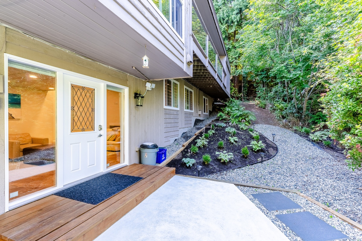 Prywatny apartament w suterenie z jedną sypialnią w nowo wybudowanym domu. Apartament posiada w pełni wyposażoną kuchnię, prywatne wejście i 1 pełną łazienkę z prysznicem/wanną. Urządzenia: pralnia w apartamencie, pełnowymiarowy piekarnik i kuchenka, kuchenka mikrofalowa, lodówka i zmywarka. Zwierzęta i dzieci mile widziane! Łóżko typu king size w oddzielnej sypialni z garderobą. Podwójna rozkładana sofa w salonie. Dostępny sprzęt dla niemowląt. W pobliżu sklepy i słynny na całym świecie Lynn Canyon Park. Uwaga – to jest apartament w piwnicy. Reg'n H335588166