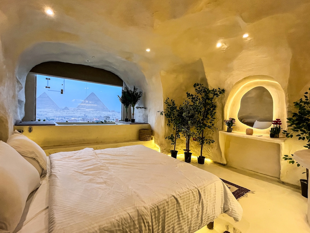 Górska jaskinia z widokiem na piramidy i jacuzzi