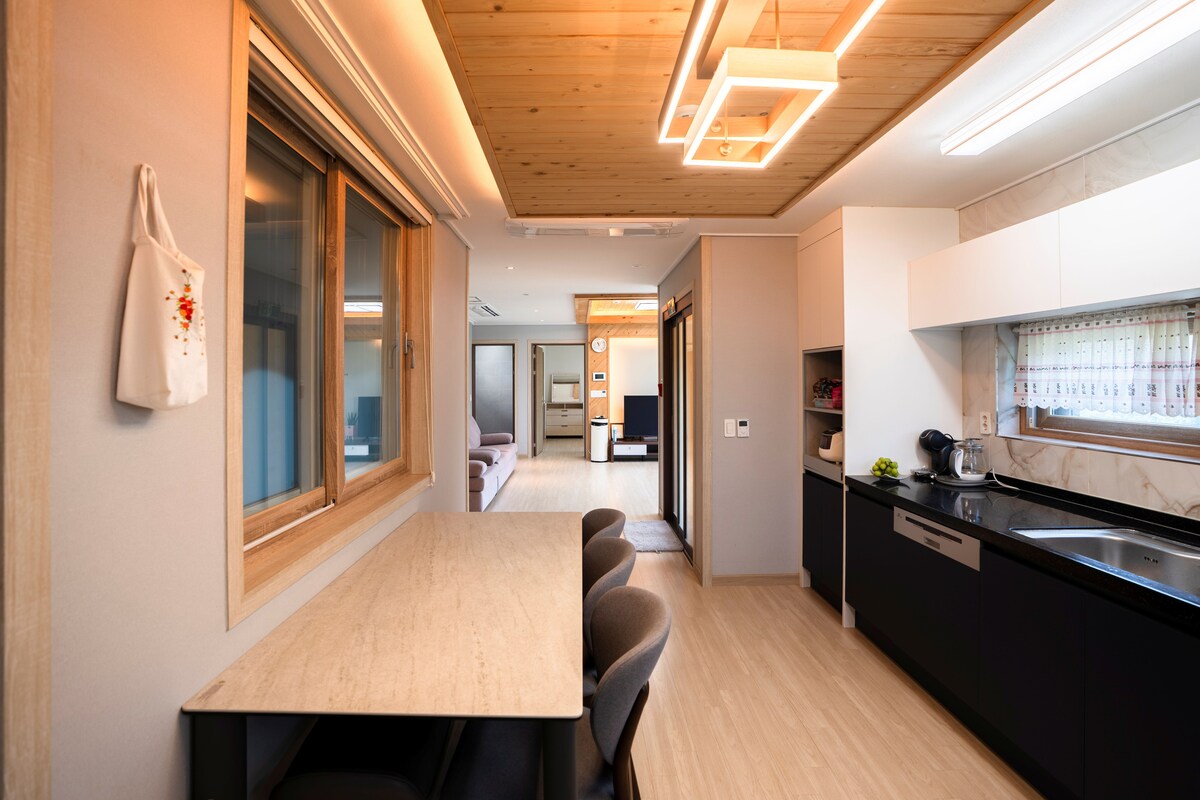 Przyjedź do nas i ciesz się żywym wiejskim klimatem! To przytulny, nowo wybudowany dom wolnostojący o powierzchni 132 metrów kwadratowych, położony w słynnym mieście Changpyeong, które jest znane jako powolne miasto. Po otwarciu bramy, czeka na Ciebie duży trawnik i otwarty taras. Tutaj możesz zorganizować grilla lub bawić się ze swoim zwierzakiem. Wchodząc do domu, rozpościera się otwarty salon, a wspaniały widok na górę Wolbongsan za oknem zapewnia uzdrowienie. Wokół obiektu znajduje się las sosnowy, więc można spacerować i poczuć spokojny urok Changpyeong. A zaledwie 40 metrów od obiektu znajduje się pole golfowe Changpyeong Golf (par 3), które można odwiedzić bez rezerwacji! Jest to idealne miejsce do relaksu i lekkich ćwiczeń. Zrelaksuj się, podziwiając zmieniające się codziennie kolory zachodzącego słońca!