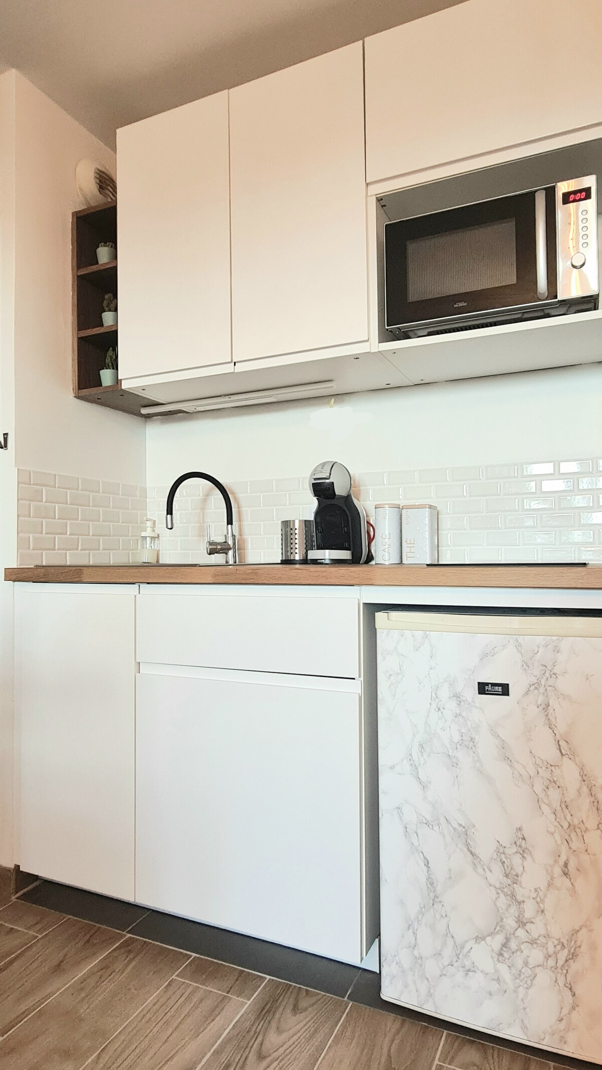 Ten uroczy apartament typu studio o powierzchni 29 m2, idealnie położony, może pomieścić do 3 osób dorosłych – lub parę i 2 dzieci (duże łóżko dla 2 osób dorosłych, 2-osobowa kanapa). Taras o powierzchni 7 m2 z widokiem na ogrody oraz mały balkon sprawiają, że jest to bardzo przyjemna, otwarta i jasna przestrzeń. Przede wszystkim mieszkanie znajduje się mniej niż 50 metrów od plaży i 400 metrów od wszystkich sklepów przy Rue des Bains.