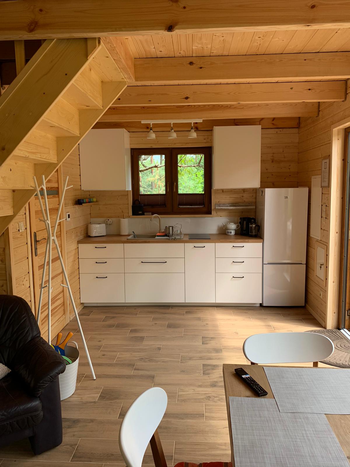Zapraszamy do całorocznego domku, położonego pod lasem w samym sercu Kaszub. To idealne miejsce, aby odpocząć od miejskiego zgiełku i zregenerować siły. Piękna okolica sprzyja pieszym i rowerowym wycieczkom. W domku wynajmujemy dwie sypialnie na piętrze a na parterze udostępniamy kuchnie, łazienkę, jadalnie z TV i kominkiem oraz zadaszony taras. Z tarasu rozpościera się widok na łąki, las oraz staw.