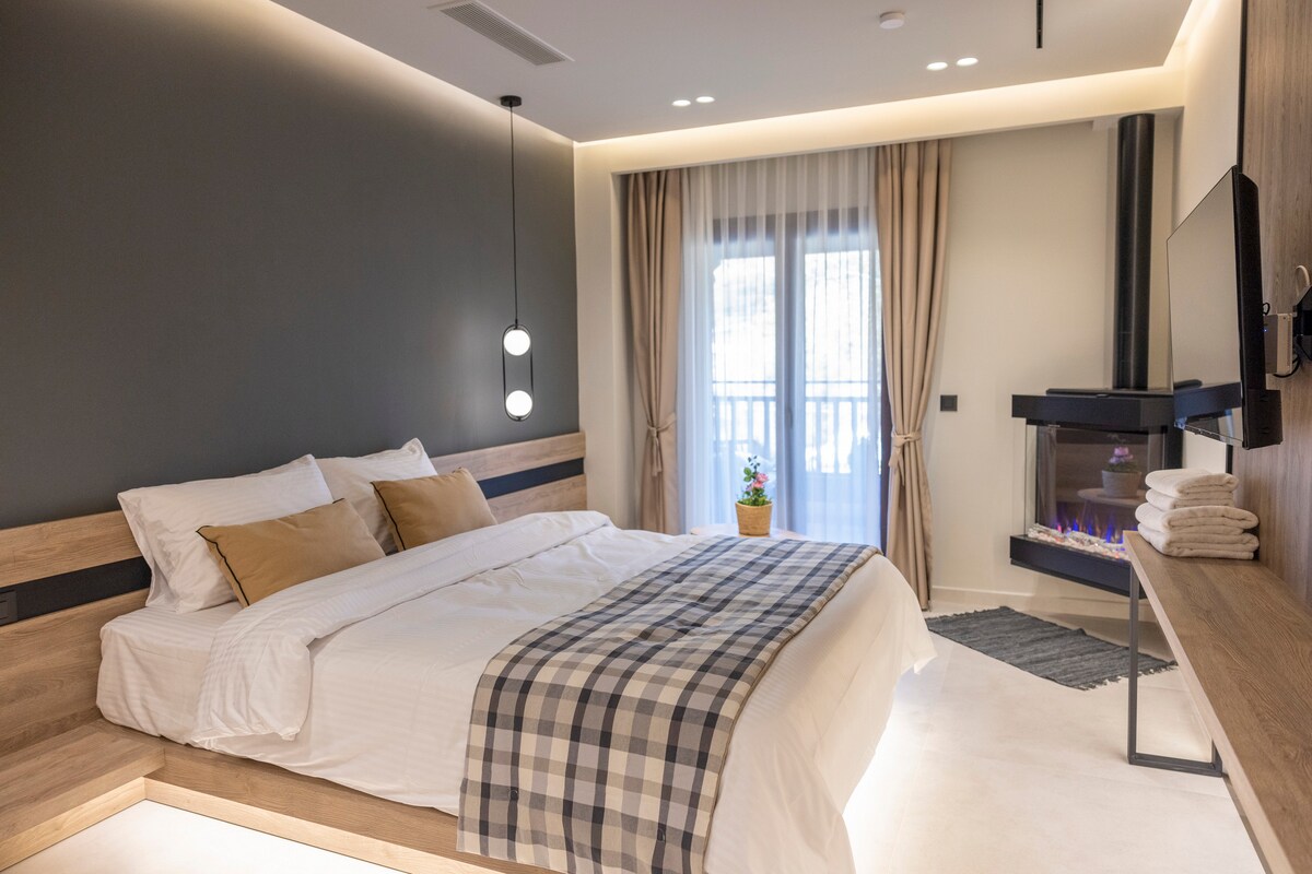 Standar double room king size bed 160x200 Meteora view and electric fireplace The bathroom has a hydromassage shower cabin.