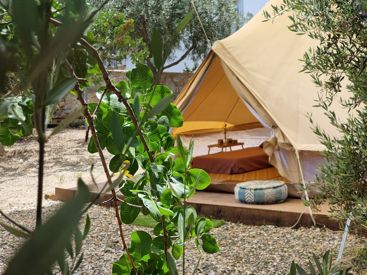 Namioty dzwonowe położone są między pistacjami a drzewami oliwnymi. Namioty dzwonowe wyposażone są w pluszową pościel, gniazdka elektryczne i elektryczne z mnóstwem portów USB, wentylator cokołowy i wieszak na ubrania. Gwarantujemy ochronę przed stworzeniami przyrodniczymi - komary i robaki nie mają szans z 360-stopniową ścianą i siatkowymi drzwiami. Luksusowe wspólne toalety i prysznice znajdują się zaledwie kilka metrów od namiotu. Do dyspozycji gości jest prywatna przestrzeń z ławką piknikową i hamakiem.