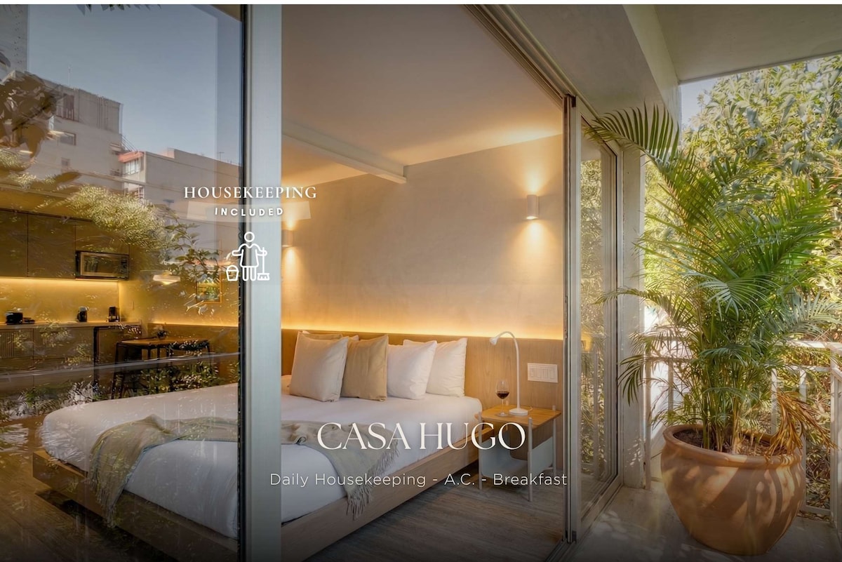 To świeżo odnowiona tradycyjna kamienica położona w prawdziwej Rzymie. Ciesz się łóżkiem typu kingsize z pianki memory, spokojem 2 prywatnych patio z dużą ilością roślin, wanną dla dwojga i dużą ilością charakteru w gnieździe, które jest jednocześnie klasyczne i fajne. Apartament został zaprojektowany tak, aby zapewnić przytulność, idealną do odpoczynku po przygodach w Meksyku, zachowując jednocześnie tradycyjny smak. Lokalizacja jest bezkonkurencyjna, jedna przecznica od targu Medellin i niektórych najmodniejszych miejsc w mieście.