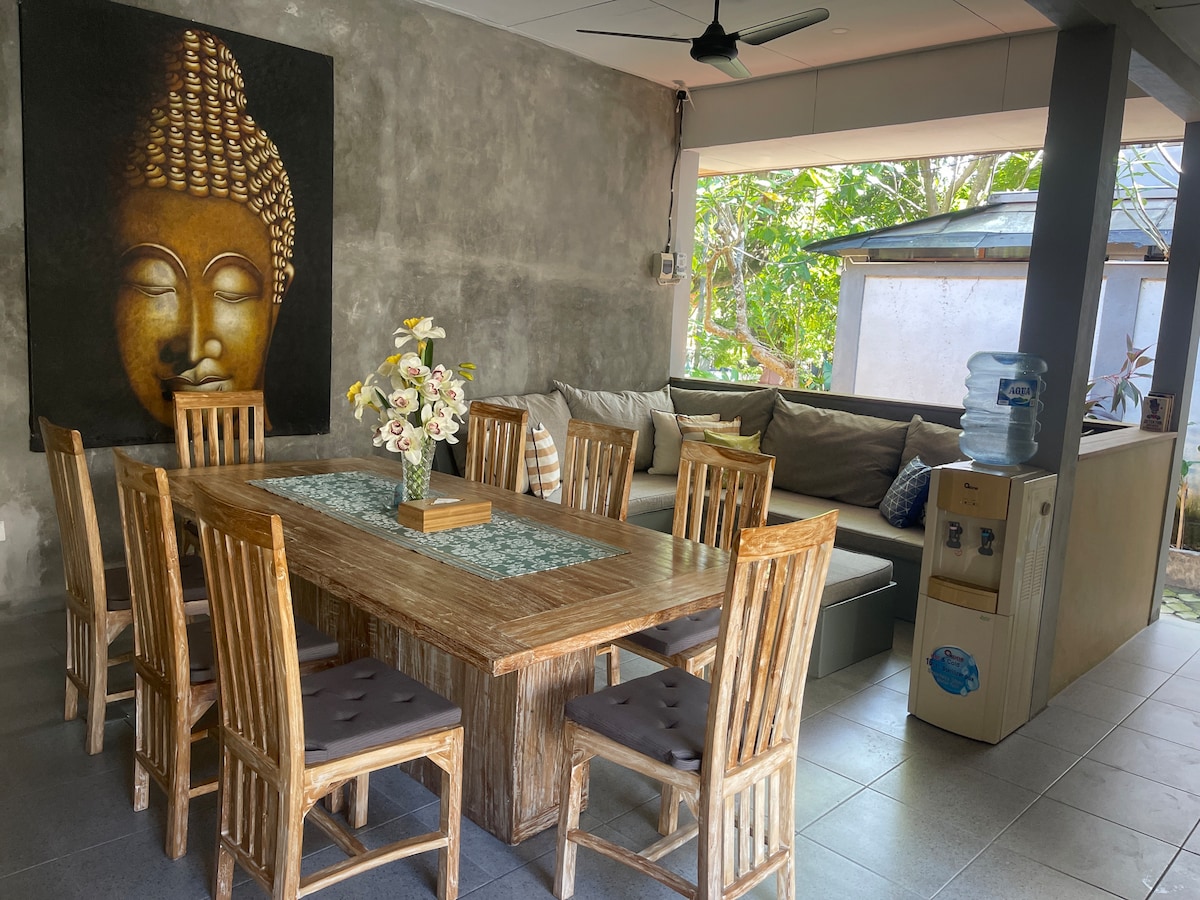 Spokojna willa z 3 sypialniami, każdy pokój z własną łazienką, położona wśród bujnych drzew, zapewniająca spokojną atmosferę. Część małego kompleksu, jest prywatna, ale oferuje wspólny basen. Przestronne, z pełną kuchnią i przytulnym tarasem. Zaledwie kilka minut drogi od Sanur Beach, lokalnych kawiarni i restauracji. Blisko popularnych miejsc, takich jak Hardy's Sanur, i tylko kilka minut jazdy od tętniącej życiem Jalan Danau Tamblingan. Idealne miejsce na relaksujący pobyt w Sanur! **Uwaga: w okolicy trwają prace budowlane.