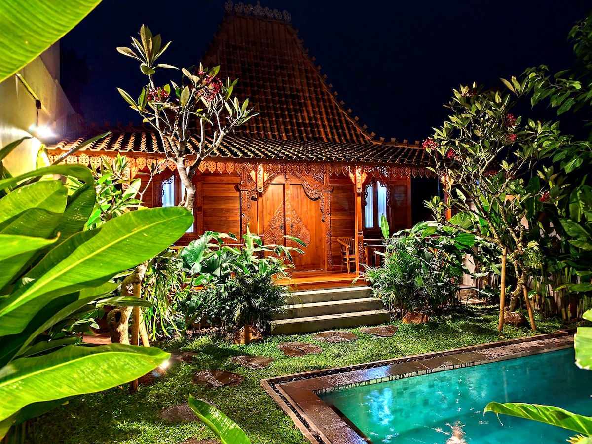 Prywatna willa Joglo z własnym basenem, zaprojektowana dla gości, którzy potrzebują przestrzeni i niezależności. Dom ma kuchnię na otwartym planie i przestrzeń dzienną wypełnioną naturalnym światłem, tradycyjną drewnianą architekturę i spokojną okolicę zapewniającą pełną prywatność. Sama okolica jest spokojna i cicha, ale willa znajduje się w centrum. Lotnisko, Kuta, Sanur i Denpasar znajdują się w niewielkiej odległości, co sprawia, że jest to praktyczna baza, a jednocześnie spokojne miejsce.