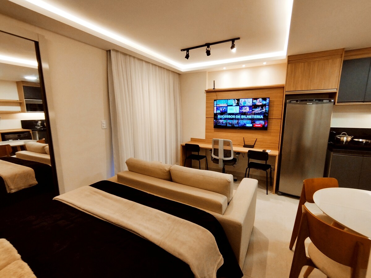 Super komfortowy apartament typu studio z bezkonkurencyjną lokalizacją dla Twoich spotkań służbowych i/lub wypoczynku. ► Podwójne łóżko z materacem sprężynowym; ► Smart TV 40” (w tym Netflix, Prime Video, Disney+ i Globoplay); ► Klimatyzacja ► Wentylator turbo ► Rolety zaciemniające ► Szafa z wieszakami; ► Głośnik Bluetooth; ► Biurko do nauki/pracy z lampą; ► Rozkładana sofa dla pary; ► Stół do jedzenia ► Kuchnia wyposażona w sprzęt do przygotowywania małych posiłków.