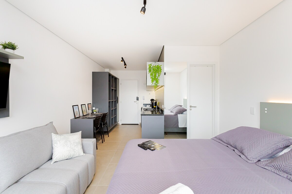 Stworzyliśmy tę urocze studio, aby zapewnić Ci niezapomniane wrażenia podczas wizyty w Curitibie. Znajduje się przy wejściu do Ogrodu Botanicznego, w pobliżu UFPR i FIEP. Może pomieścić do 3 osób z dużym komfortem. Przytulna atmosfera z: - klimatyzacja ciepła/zimna - zintegrowaną sypialnią, salonem i kuchnią - łóżko typu queen - telewizorem SmartTV - Wi-Fi - deska do prasowania/żelazko - suszarka do włosów - minibar - pościel, ręczniki, poduszki, koce - miejsce PARKINGOWE na zamkniętym terenie obok apartamentu