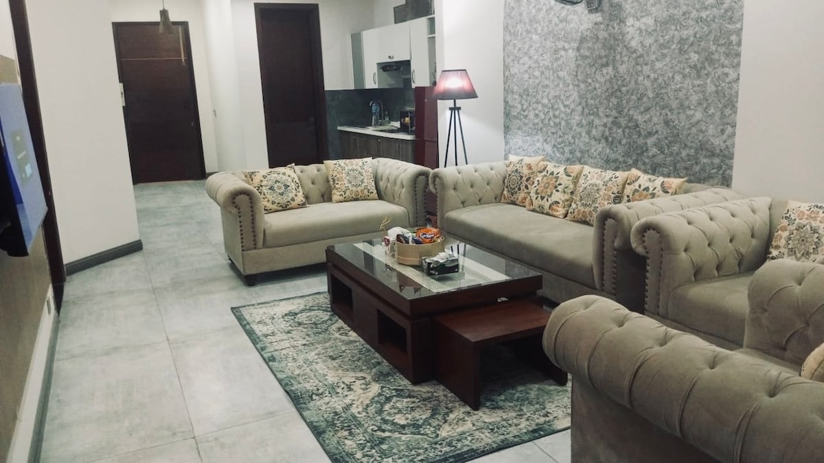 Witaj w @blueoakresidences Przestronny apartament o powierzchni 1500 stóp kwadratowych w F-11/1 Islamabad z 2 sypialniami z łazienką, każda z prywatnym balkonem, toaletą, zasilaniem awaryjnym UPS, szybkim Wi-Fi, samodzielnym zameldowaniem i 58-calowym telewizorem Smart TV. W pełni wyposażona kuchnia, ciepła woda, bezpłatny parking, winda czynna 24/7. Dla grup większych niż 4 osoby zapewniamy 2 dodatkowe materace podłogowe, aby zapewnić komfortowy pobyt dla maksymalnie 6 osób. Kilka kroków od Loafology, Nando's, Asian Wok, KFC, Al-Fatah. Park dla rodzin tuż obok.