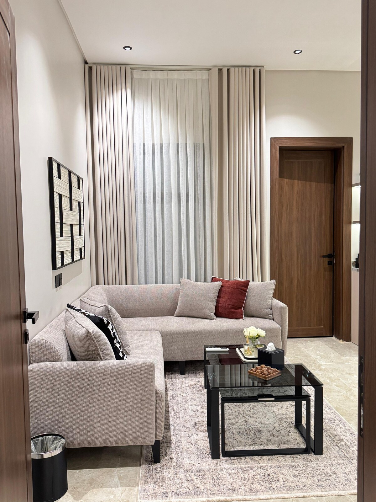 Elegant apartment with hotel services available - Hospitality service: add tea - coffee - sugar - water - Health service: shampoo - salper - soap - - wipes - knights and paste - Free internet service. - Self-entry -Private parking -Shahid account -Kitchenette . Close to supermarket, restaurant, coffee, laundry, few meters. Diriyah is about 8 km away and the Boulevard is 10 km 2A2 metro station is about 14 minutes away and Irqa 501 bus station is about 10 minutes away