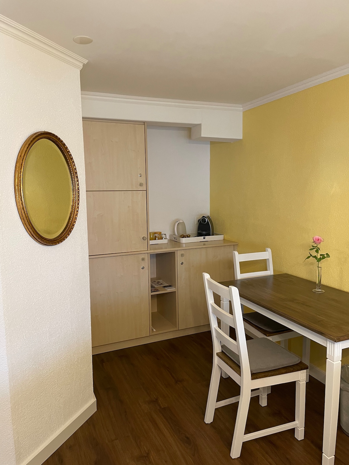 Studio jest zintegrowane z historycznym gospodarstwem rolnym, otoczonym piękną przyrodą, ale blisko lotniska i blisko Zurychu z dobrymi połączeniami autobusowymi/kolejowymi. W drugiej części gospodarstwa znajduje się mój dom, a nad studiem moja pracownia ceramiki. Studio ma oddzielne wejście. Obiekt jest odpowiedni na krótkie i długie pobyty. W pobliżu można zrobić zakupy.