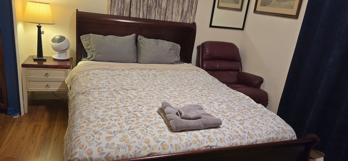 Miejsce dla 2 osób. Prywatne studio, prywatne wejście, parking przed domem. Zakaz palenia w studio. Duży prysznic z płynem do płukającym, zdejmowaną głowicą, łóżkiem typu KING, kolorowym telewizorem, kablówką, Wi-Fi. Stół wystarczająco duży, aby można go było używać do pracy, kuchenka mikrofalowa, ekspres do kawy, toster, lodówka, komoda, skrzynia z wieszakiem i pościel. Na zewnątrz znajduje się część wypoczynkowa do palenia i relaksu. Dodatkowa klimatyzacja/grzejnik zainstalowane wraz z naszą główną domową standardową jednostką systemu centralnego dla dodatkowego komfortu kontrolowanego przez Ciebie