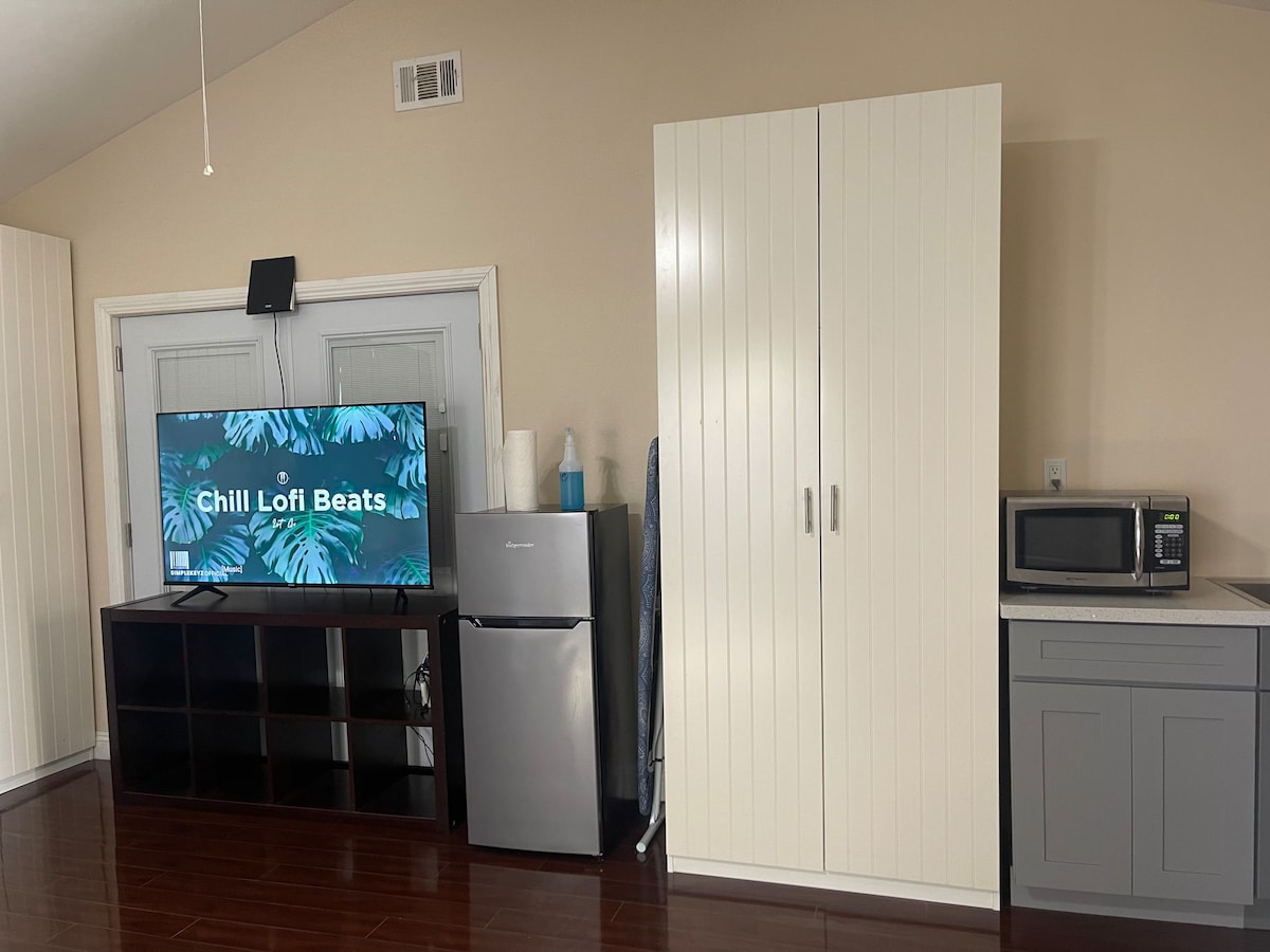 Approximately 650 sq. ft. Studio. Comfortable King bed. Sleeps 2 comfortably, optional for 3rd guest up to your discretion. Ample closet space. Smart TV so you can log into your favorite tv applications. Couch, coffee table and dresser in open concept bedroom/living room. Full kitchen. Fast WiFi. In unit free Washer/Dryer (detergent). Refrigerator with ice maker. Glass Kettle hot pot (instant coffee). Completely sanitized and clean. This is not a shared place. Enjoy