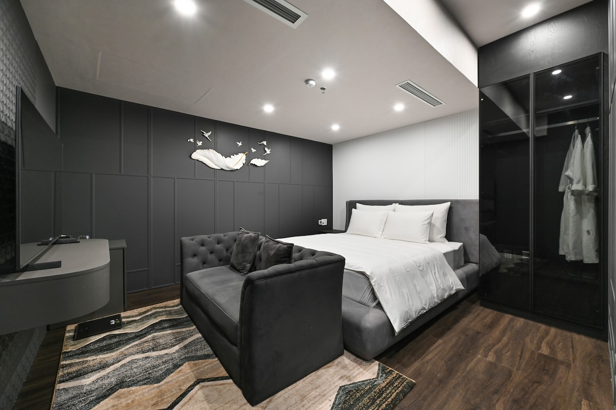 Luxury VIP Suite | Modern Comfort & Elegant Design Indulge in the ultimate comfort at our top-rated VIP suite — the most luxurious stay in the area. This spacious room features elegant wood accents, premium furnishings, a king-size bed, and a cozy living area with a large TV and sound system. The bathroom offers a modern rain shower and double sinks for your convenience. Perfect for couples or business travelers who appreciate sophistication, privacy, and style.