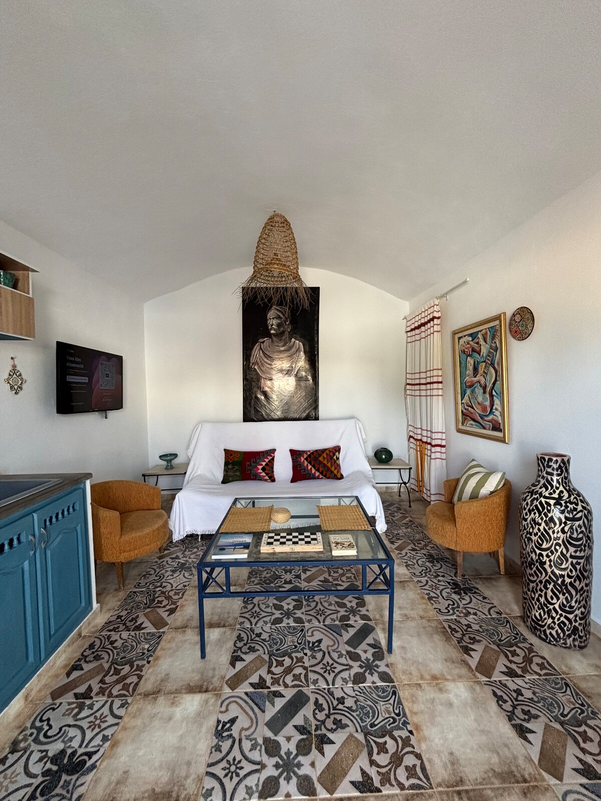 Odkryj apartament na dachu Djerbahood, z którego roztacza się wyjątkowa panorama na otaczające freski. Jego ogromna przestrzeń mieszkalna otwiera się na przestronny taras, gdzie światło zalewa każdy zakątek. To miejsce, które łączy autentyczność i nowoczesność, jest usypiane artystycznym duchem okolicy: wyposażona kuchnia, klimatyzacja, Wi-Fi. Nadmuchiwany basen i strefa wypoczynkowa z meblami ogrodowymi dopełniają wystrój, idealny do spędzania wspólnych chwil.